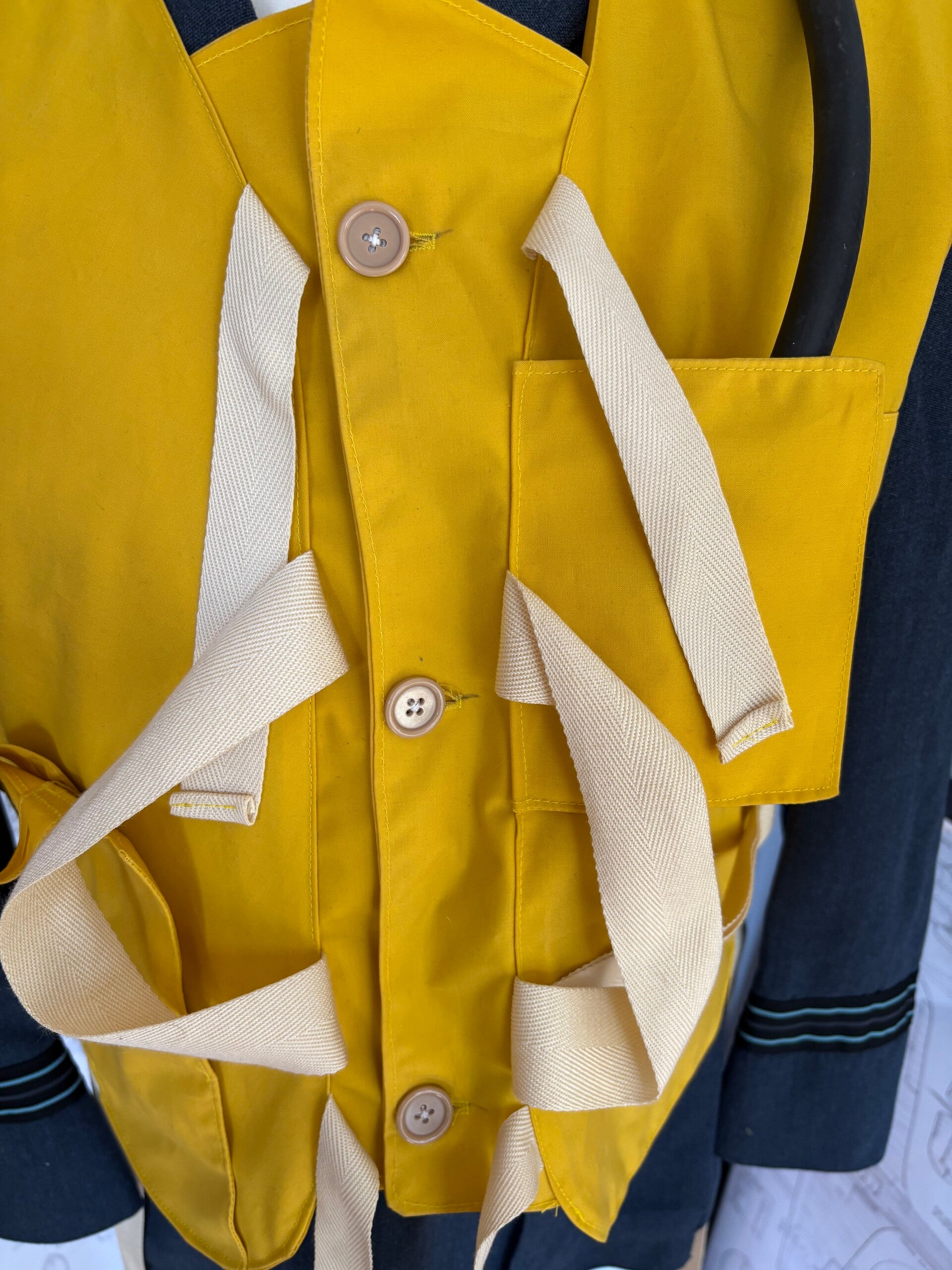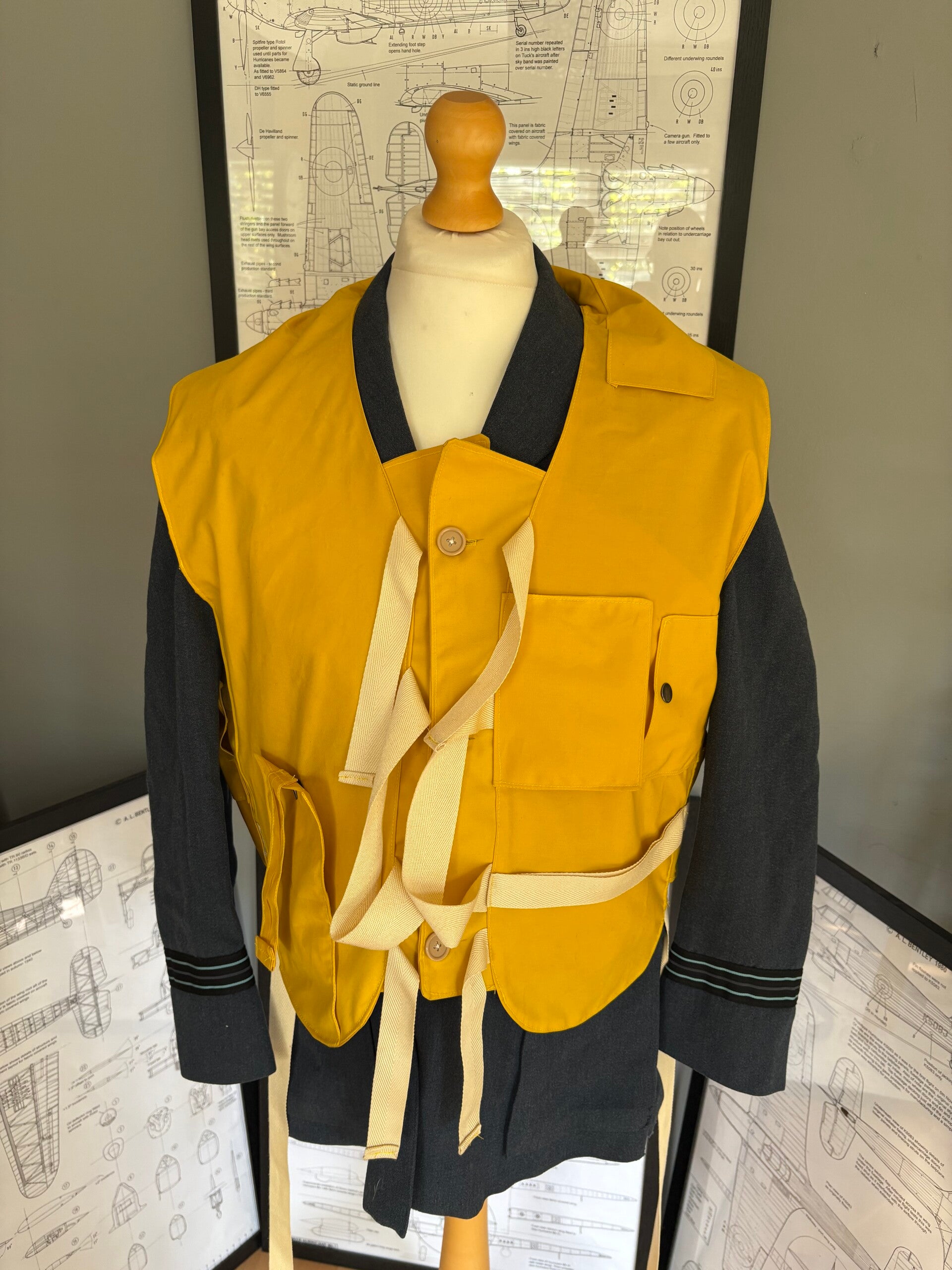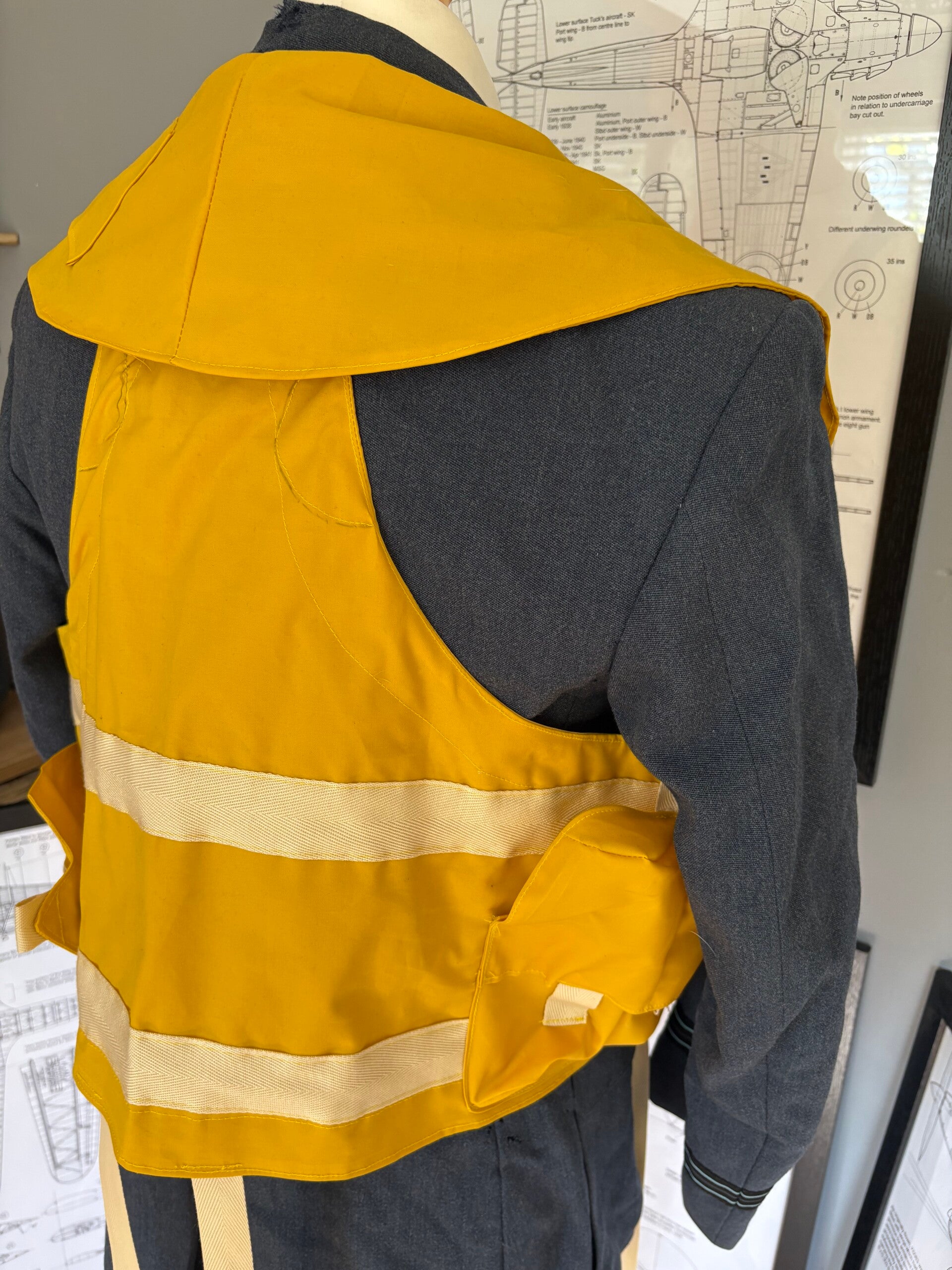Replica WW2 RAF 1941 pattern Mae West life preserver. Made of strong water resistant fabric. Feels great to touch, fitted with metal zip, ties at the front, leg ties, pockets, and flaps as original.